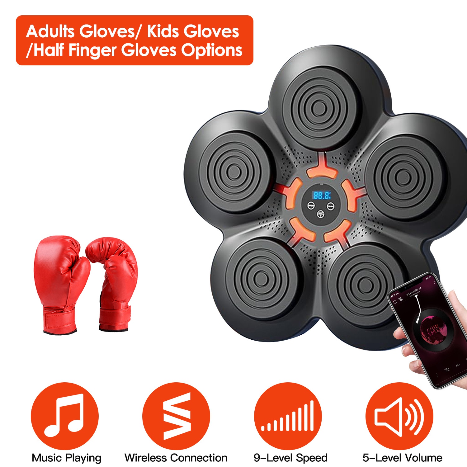 It's a portable compact but efficient and fun boxing equipment. Designed with 9 modes of jumping red light to improve your reaction speed, endurance, or help you keep fit or lose weight. You can adjust 9 levels of speeds, suitable for both novices and boxers, both kids and adults. Wireless connecting mode allows you to play the music you like while boxing, greatly enhancing your experience and having more fun. Just stick the hook&loop strip on the wall and paste the machine, then you can enjoy the boxing fun. We also provide you with a pair of gloves for using. Adults/Kids/Half Finger Gloves can be chosen according to your needs.